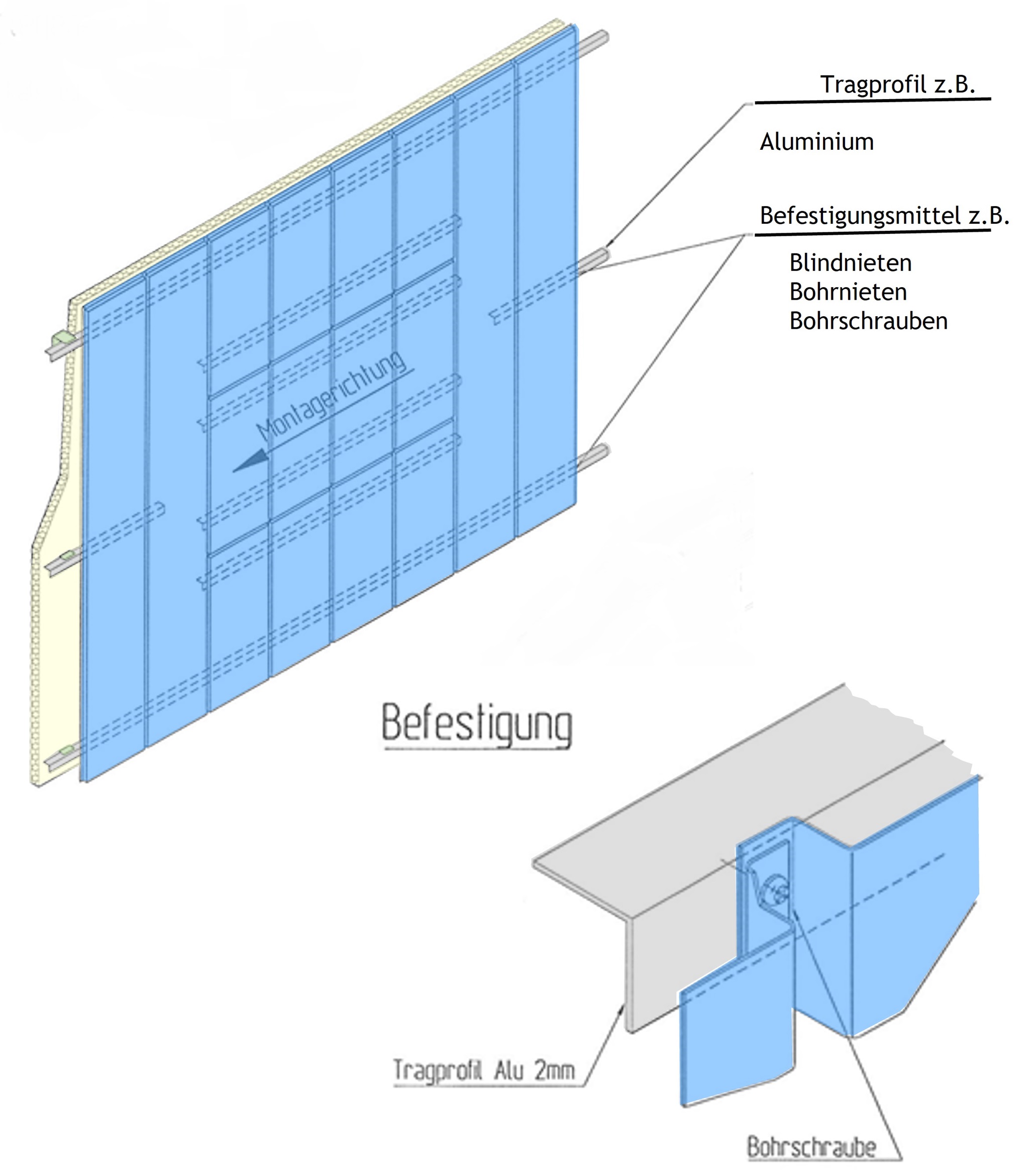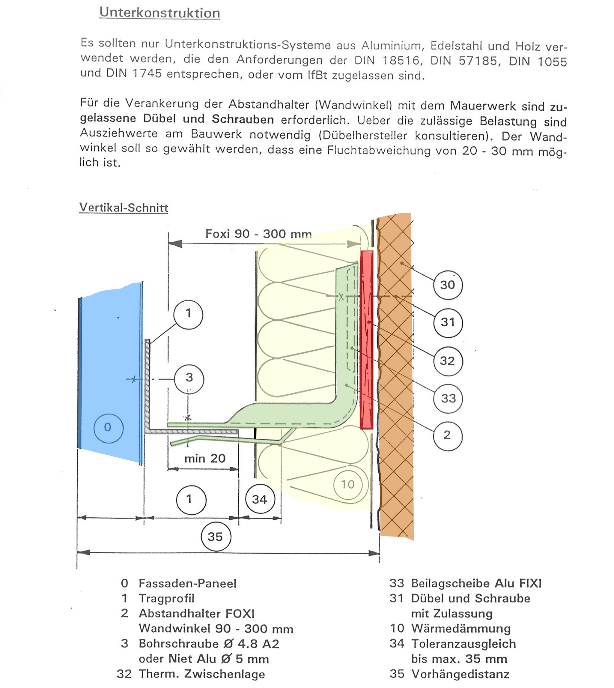 - Die Unterkonstruktion einschließlich der Befestigungsmethode (Statik) und die Dicke der Wärmedämmung wird von einem Ingenieurbüro berechnet.
