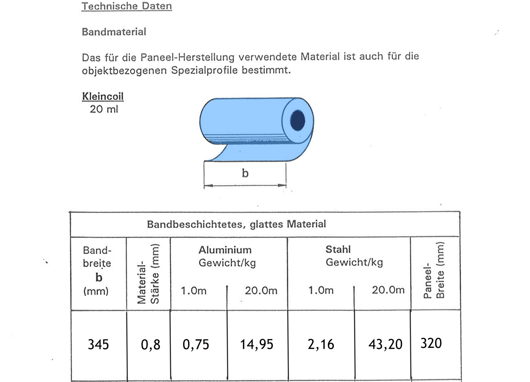 Zur Herstellung von objektbezogenen Spezialprofilen kann das für die Paneel-Herstellung verwendete Bandmaterial in der Breite von 342 mm als Meterware von Dobner bezogen werden. Damit haben Sie die Möglichkeit individuelle Profile durch Abkanten selbst herzustellen.