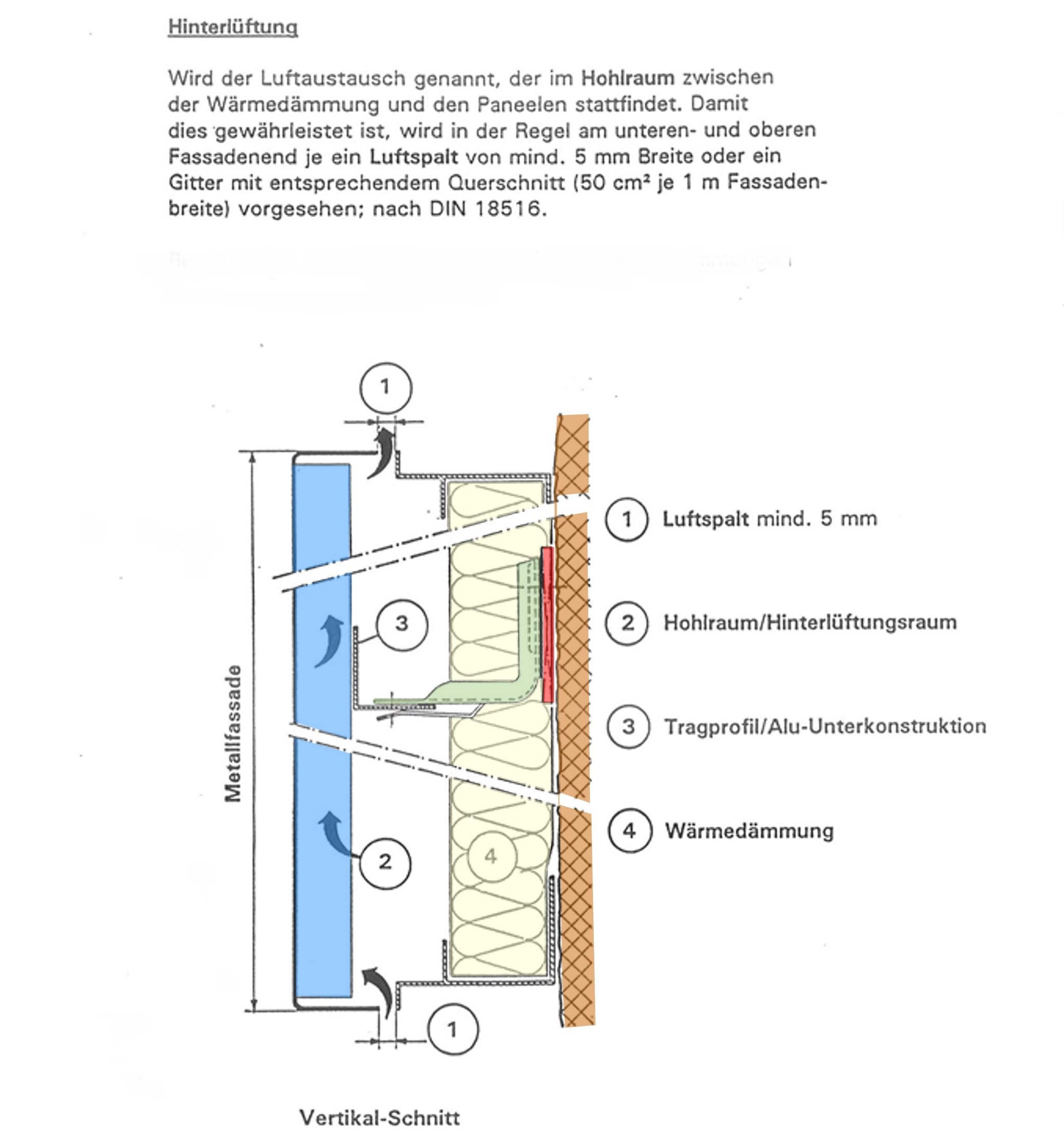Hinterlüftung wird der Luftaustausch genannt, der im Hohlraum zwischen der Wärmedämmung und den Aluminium-Paneelen stattfindet. Damit dies gewährleistet ist, ist in der Regel am oberen und unteren Fassadenende ein Luftspalt von ca. 5 mm Breite erforderlich.